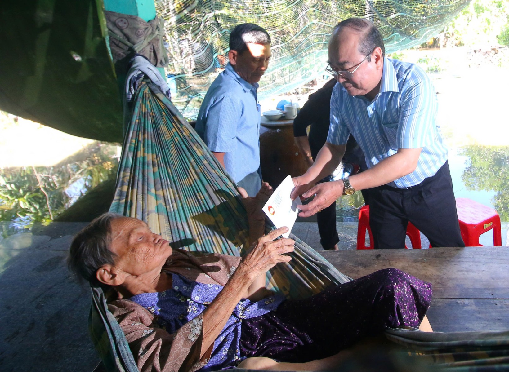 Đồng chí Trần Văn Chính, Ủy viên Ban Thường vụ Thành uỷ, Phó Chủ tịch Thường trực Uỷ ban MTTQ Việt Nam thành phố trao tiền hỗ trợ hộ dân bị thiệt hại do triều cường gây ra