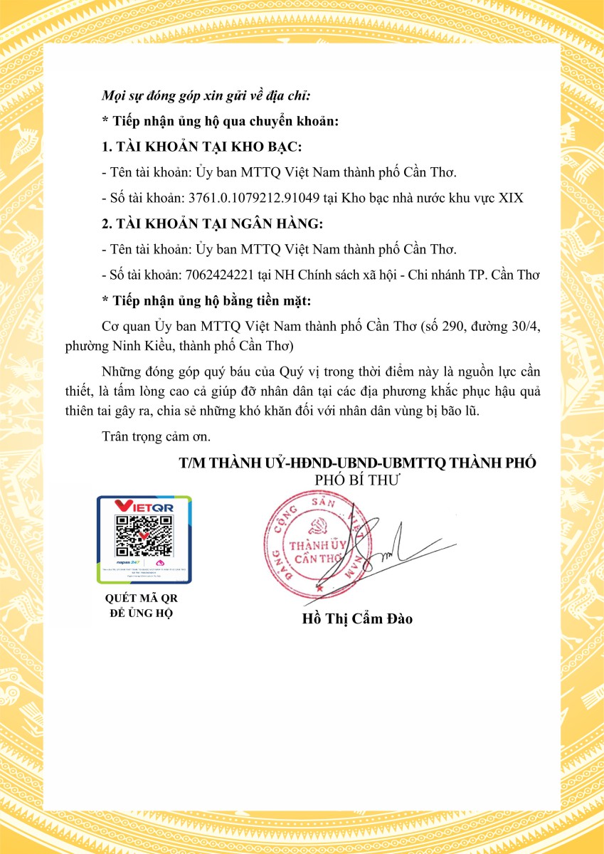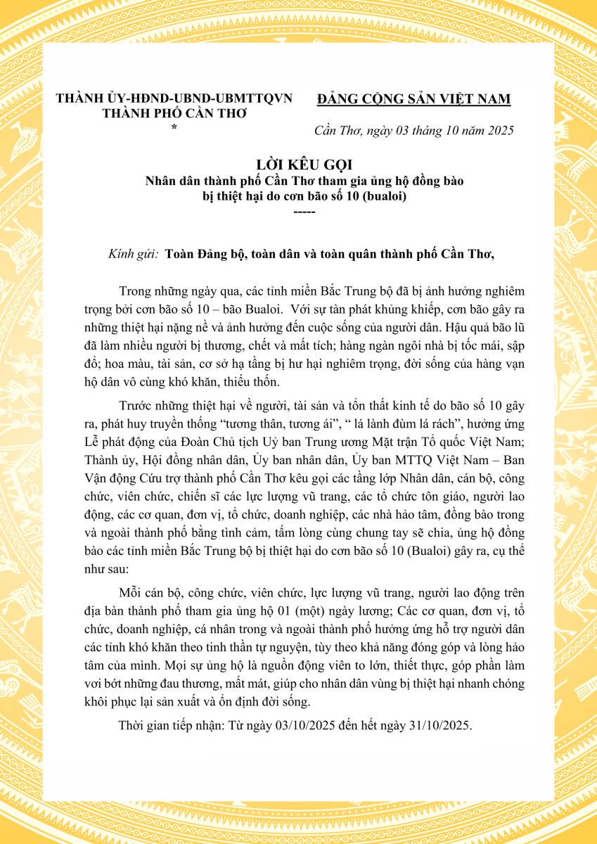 Lời kêu gọi Nhân dân thành phố Cần Thơ tham gia ủng hộ đồng bào bị thiệt hại do bão số 10 (Bualoi)