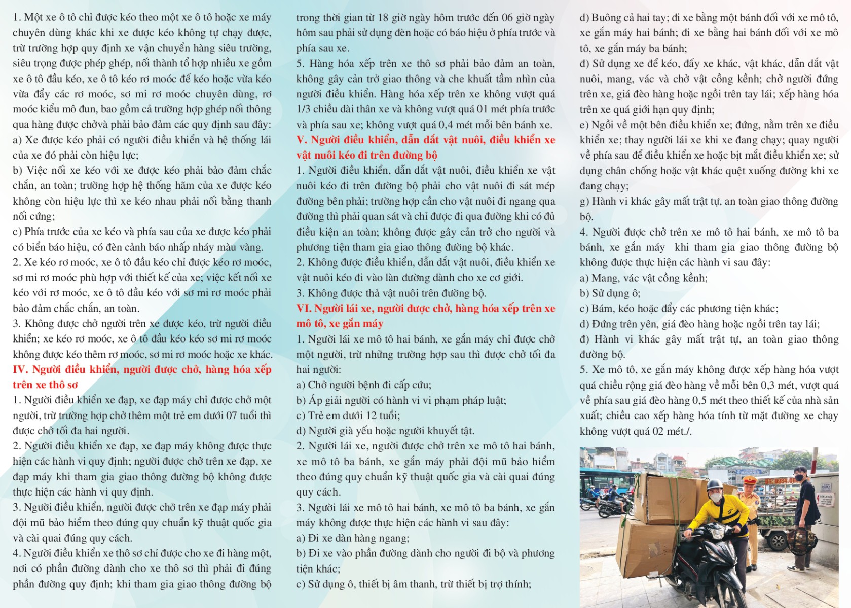 Quy định người đi bộ; trẻ em, phụ nữ mang thai, người già yếu, người khuyết tật, người mất năng lực hành vi dân sự tham gia giao thông đường bộ; người lái xe, người được chở, hàng hóa xếp trên xe mô tô, xe gắn máy; trường hợp chở người trên xe ô tô chở hàng