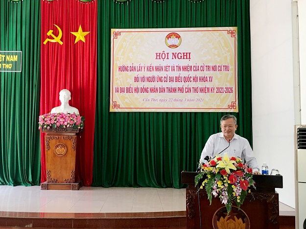 Phát biểu chỉ đạo tại Hội nghị, ông Nguyễn Trung Nhân - Ủy viên Đoàn Chủ tịch Ủy ban Trung ương MTTQ Việt Nam, Ủy viên Ban Thường vụ Thành ủy, Chủ tịch Ủy ban MTTQ Việt Nam thành phố lưu ý thêm những những công việc cần quan tâm, như: Việc tổ chức hội nghị được tiến hành công khai, dân chủ, đúng quy định pháp luật; bảo đảm sự phối hợp chặt chẽ giữa Ban Thường trực Ủy ban MTTQVN các cấp, giữa Ban Thường trực Ủy ban MTTQ Việt Nam cấp xã với UBND cùng cấp và các cơ quan, tổ chức, đơn vị có người được giới thiệu ứng cử. Thời gian tổ chức hội nghị từ ngày 21-3-2021 đến 13-4-2021. Ban Thường trực Ủy ban MTTQ Việt Nam cấp xã trực tiếp trao đổi với người được ứng cử để lựa chọn, bố trí thời gian tiếp xúc với cử tri nơi cư trú cụ thể. Địa điểm tổ chức hội nghị tại hội trường nhà văn hóa ấp, khu vực, tổ dân phố nơi người ứng cử đại biểu Quốc hội khóa XV, đại biểu HĐND thành phố nhiệm kỳ 2021 - 2026 thường trú hoặc tạm trú. Tại hội nghị cử tri nơi cư trú, cử tri đối chiếu với tiêu chuẩn của đại biểu Quốc hội khóa XV, đại biểu HĐND thành phố nhiệm kỳ 2021 – 2026 để nhận xét, bày tỏ sự tín nhiệm đối với người ứng cử. Biên bản hội nghị cử tri phải ghi rõ thành phần, số lượng người tham dự; trong đó, phải ghi rõ tổng số cử tri được triệu tập, số lượng cử tri có mặt, ghi diễn biến, kết quả hội nghị, ý kiến phát biểu và sự tín nhiệm của cử tri đối với từng người ứng cử. Biên bản hội nghị cử tri nơi cư trú lấy ý kiến nhận xét về người ứng cử đại biểu Quốc hội, đại biểu HĐND tỉnh phải được gửi đến Ban Thường trực Ủy ban MTTQ Việt Nam thành phố ngay sau khi kết thúc hội nghị.