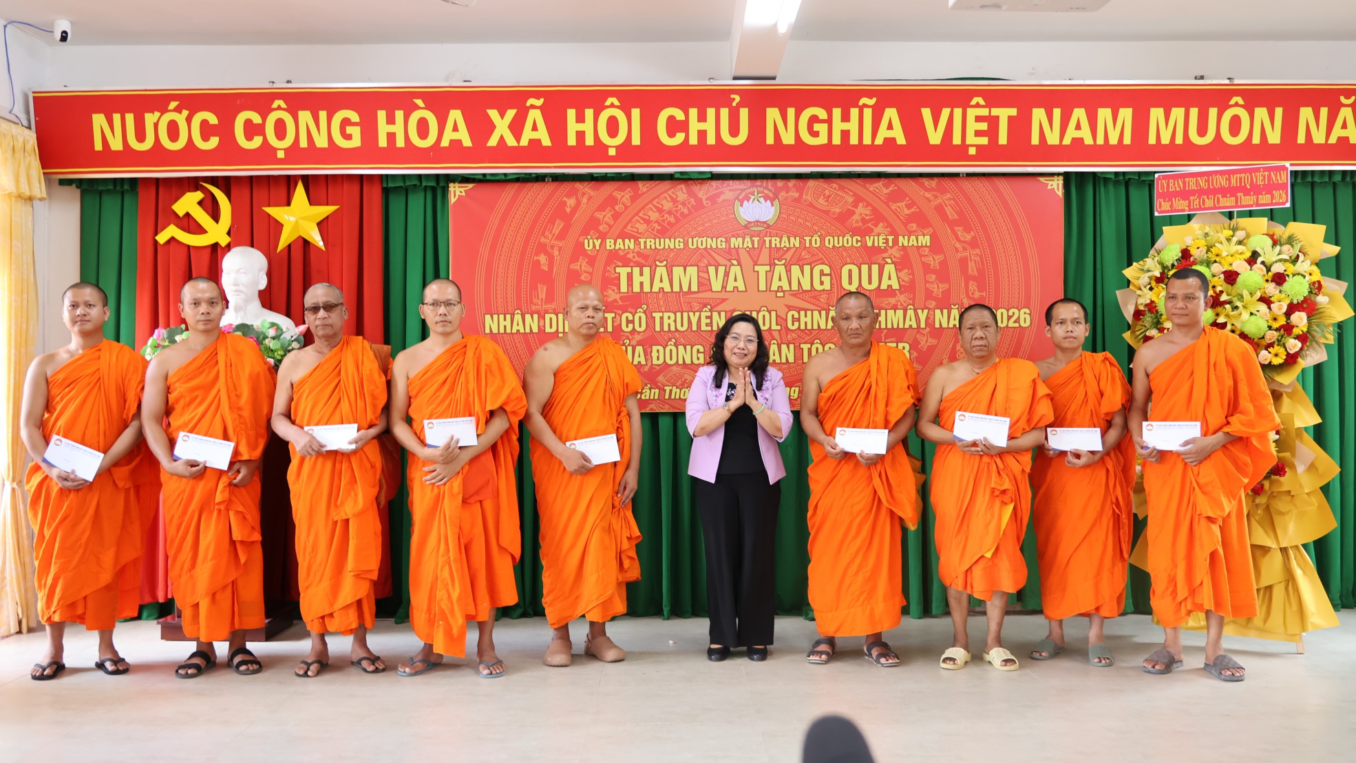 Chiều ngày 13/4, tại Trường Bổ túc Văn hóa - Pali trung cấp Nam Bộ (phường Sóc Trăng, TP Cần Thơ), đoàn công tác của Ủy ban Trung ương MTTQ Việt Nam do ông Trần Thắng, Phó Bí thư Đảng ủy MTTQ Việt Nam, các đoàn thể Trung ương làm trưởng đoàn đã đến thăm, chúc mừng Hội Đoàn kết sư sãi yêu nước thành phố; các vị chức sắc, chức việc, Achar, người có uy tín, các hộ nghèo, gia đình chính sách đồng bào dân tộc Khmer trên địa bàn thành phố nhân dịp Tết cổ truyền Chôl Chnăm Thmây năm 2026.