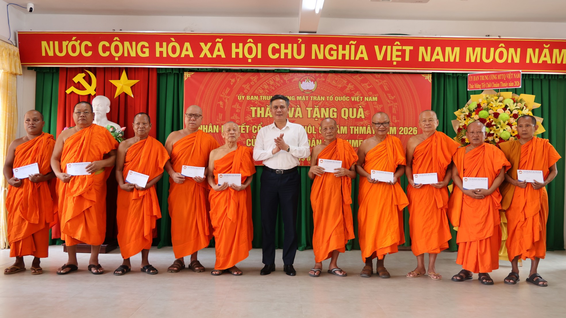 Dịp này, đoàn công tác đã trao tặng 50 phần quà cho các vị chức sắc, chức việc, Achar và người có uy tín, ghi nhận đóng góp trong vận động đồng bào chấp hành chủ trương, chính sách, giữ gìn bản sắc văn hóa. Đồng thời, đoàn trao 100 suất quà cho các gia đình đồng bào Khmer nghèo, gia đình chính sách, góp phần giúp bà con đón Tết vui tươi, đầm ấm.